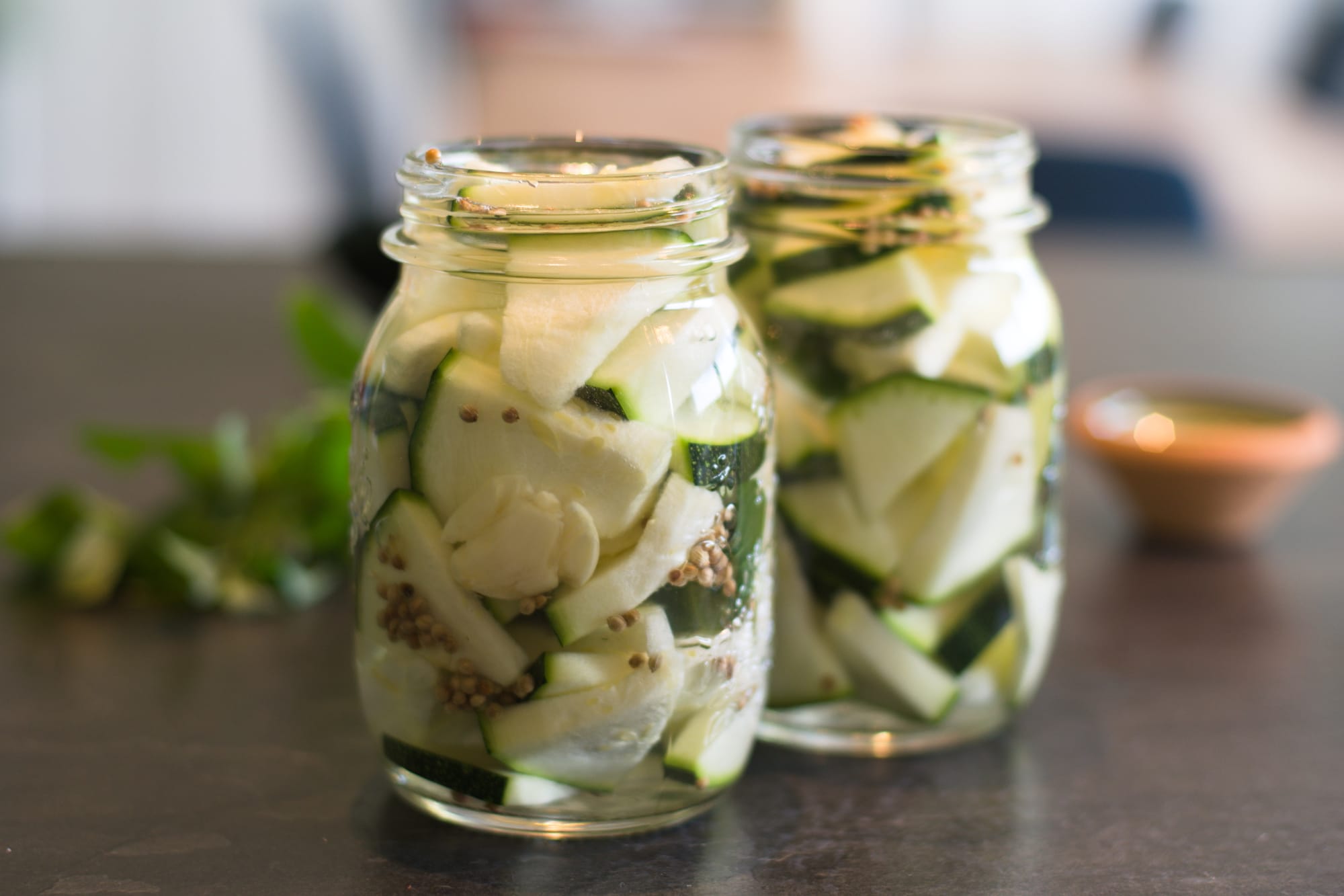 - Fill up each glass with courgettes, a clove of garlic, a teaspoon of coriander leaves, and some mint leaves. If you sliced the courgettes, make sure they don't stick too much together as this makes it harder for the brine to work